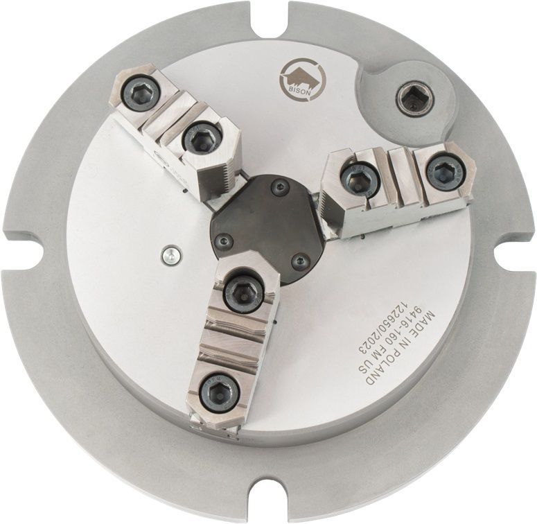 • A milling fixture in the form of a scroll lathe chuck with 2-piece jaws, integrated with the base.