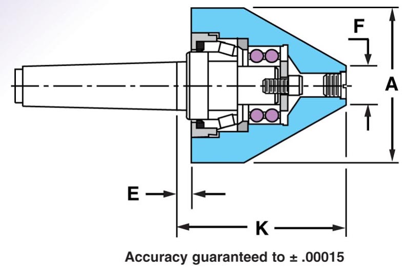 The standard duty bull nose live center is unique in that it utilizes a combination of heavy duty tapered roller bearings in the back of the tool in conjunction with a double row angular contact bearing in the front of the tool to withstand maximum radial and axial loading conditions. Most brands available on the market today simply press a bull nose head on a standard live center bearing set. The result is a tool that is woefully inadequate in comparison.