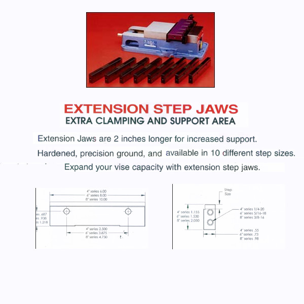 Extension Jaws are 8 inches long for increased support. Hardened, precision ground, and available in 10 different step sizes.